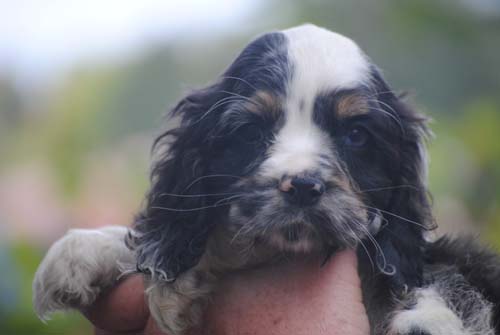 | Blk/Wht Tri Parti Cocker Spaniel Female # 12 $950 pet price Click here for more pictures of this wonderful girl! |